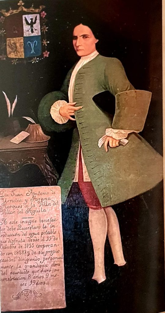 El vínculo de Urrutia con Querétaro inició en 1721 a raíz de un viaje para apoyar la fundación de un convento por parte de las Madres Capuchinas. Este viaje lo llevó a adquirir terrenos para edificar una casa donde residir durante sus visitas. Notando la deficiencia en el abastecimiento de agua en la ciudad, Urrutia emprendió la monumental tarea de construir un acueducto que llevaría agua desde un manantial a 10 kilómetros de distancia. La obra, que comenzó en 1726 y culminó en 1739, consistió en 74 arcos, alcanzando una altura de 28.42 metros y costando aproximadamente 125,000 pesos, de los cuales él cubrió la mayor parte.